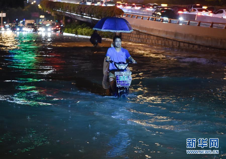9月11日,市民在福州市城区涉水出行。当晚,福建省福州市遭遇暴雨袭击,持续数小时的暴雨造成城区多处路段积水严重,给市民出行带来不便。 新华社记者 宋为伟 摄