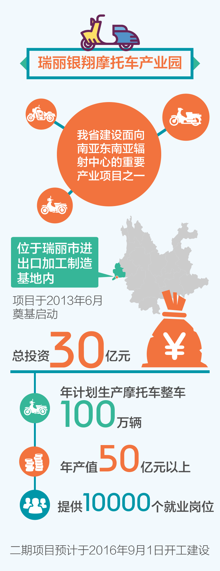 瑞丽银翔摩托车产业园是我省建设面向南亚东南亚辐射中心的重要产业项目之一。项目于2013年6月奠基启动,位于瑞丽市进出口加工制造基地内,计划年生产100万辆摩托车整车,建成后可引进40余家摩托车配套生产厂家入驻,年产值可达到50亿元以上,可提供10000余个就业岗位。