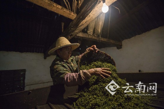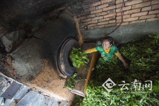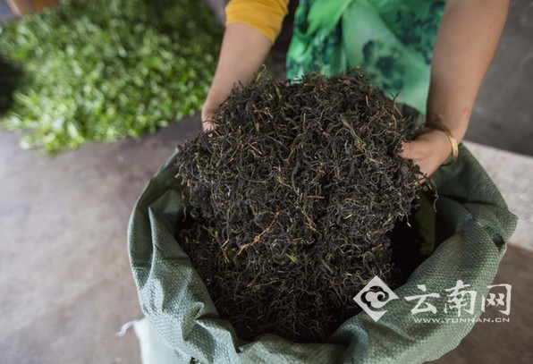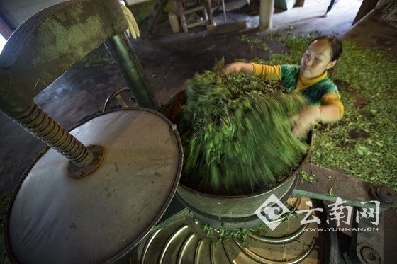 制成一公斤茶叶需鲜叶3公斤左右,茶叶鲜叶要先进行机器杀青,之后由鼓风机送入仓库,再由茶叶被分批放入揉茶机里,由人工将加工过的茶叶汇聚成堆。天气不好的时候,还要将茶叶放入烘干机烘干,整个烘干过程约4小时。