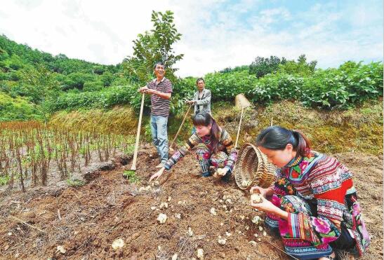大姚县六苴镇是一个典型的山区少数民族乡镇,彝族群众占55.5%,人均耕地面积少,贫困面广。近年来,当地政府扶持、补贴1161户贫困农民参与百合、魔芋种植等特色产业发展,种植百合面积达1260亩,帮助农民脱贫增收。图为大破箐村民小组的彝族群众在收百合。新华社记者 杨宗友 摄