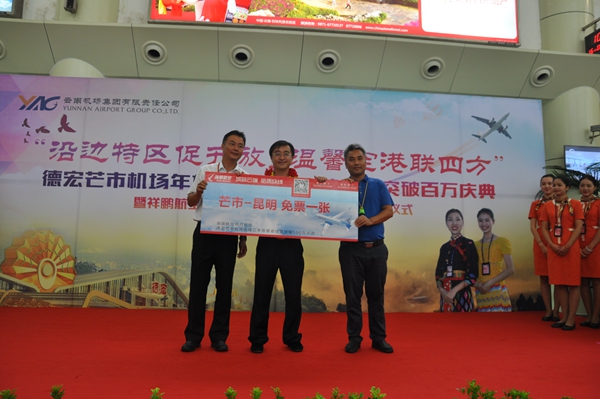 当天上午,芒市机场候机楼里传来捷报,一名乘坐瑞丽航空的旅客,幸运的成为第100万名旅客。机场工作人员把该名旅客邀请到了“沿边特区促开放 温馨空港联四方”主题活动现场,向他赠送了一张芒市-昆明的机票。