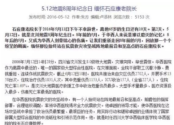在石应康去世后第二天,华西医院网站上发出纪念文章。