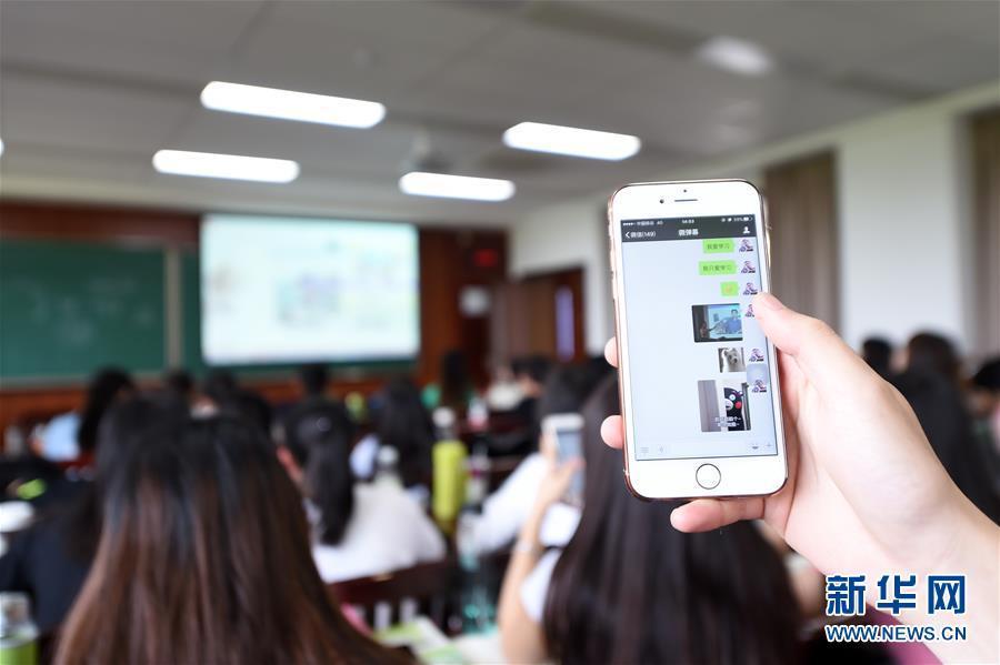 5月24日,一位同学在展示其通过微信“弹幕”发给老师和投影仪的内容。重庆大学新闻学院大二选修课《网络与新媒体》放弃传统课前点名方式,通过微信对学生进行定位签到。课程通过微信记录下的定位签到记录和课堂测验记录都将在期末折算成平时成绩。该选修课授课老师还通过微信进行课堂教学,允许学生在课堂上随时通过微信“弹幕”提问并与老师互动。新华社记者 唐奕 摄