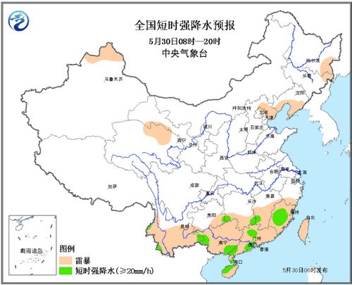 中新网5月30日电 据中央气象台官网消息,预计5月30日08时至31日08时,云南南部、贵州东南部、广西南部、湖南南部、江西南部、福建、广东中西部、海南、四川东北部、重庆西北部、陕西南部等地的部分地区有短时强降水天气,小时雨强20-40毫米,局地可达40毫米以上。辽宁西部局地将有8-9级的雷暴大风天气。