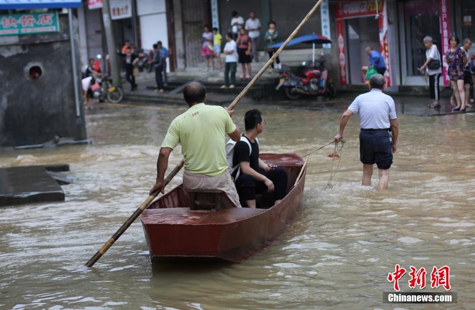 6月14日,湖南省道县遭遇强降雨袭击,县城寇公街低洼处被漫上的河水淹没,最深处约1米,群众需借船出行。气象部门预计,14日晚至15日,湖南省将遭遇新一轮强降雨,湘中以南部分地区有暴雨,局部地区大暴雨。目前,道县已启动防汛四级应急响应,确保安全度汛。何红福 摄