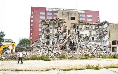 昨天下午原子能楼的拆除已经暂停 摄影/本报记者 郝羿