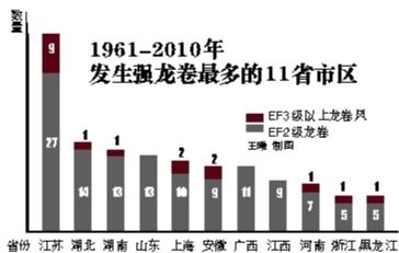 中国天气网昨天公布了一组数据,在1961-2010年出现强龙卷风最多的省市,江苏排第一位。