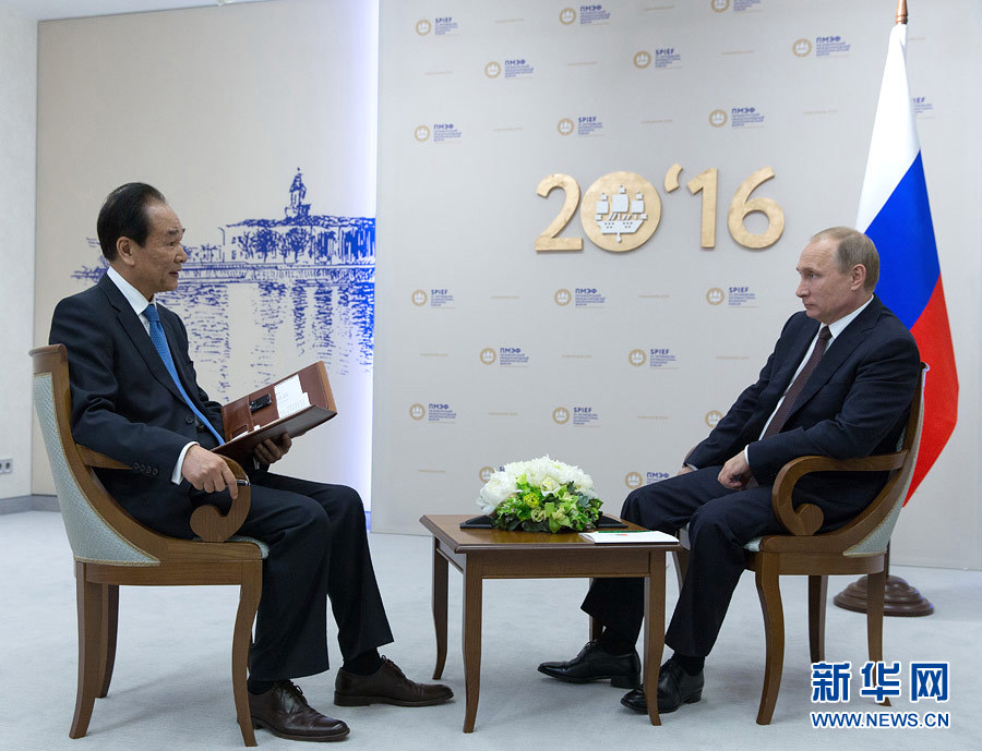6月17日,在俄罗斯圣彼得堡,俄罗斯总统普京接受新华社社长蔡名照独家专访。普京表示,中俄两国的互信达到前所未有的高度,两国应丰富双边关系合作内涵,扩大双边贸易、提高技术合作水平、加强基础设施建设合作,并在国际舞台上携手维护国际稳定,共同推动“一带一路”与欧亚经济联盟建设对接。新华社记者白雪骐摄