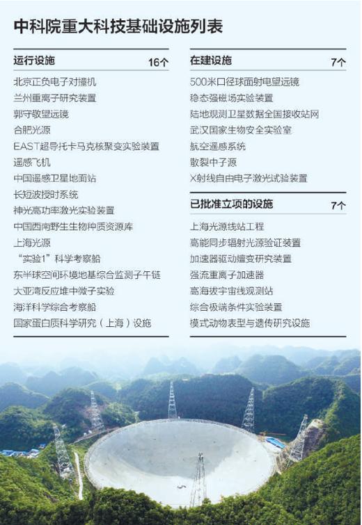 这只是中科院目前运行和在建的23个重大科技基础设施的其中之一。作为承担我国重大科技基础设施建设和运行的主要力量,中科院负责的项目涉及时间标准发布、遥感、粒子物理与核物理、天文、同步辐射、地质、海洋、能源和国家安全等众多领域,其中有的是为特定学科领域的重大科学技术目标建设的专用研究设施,如北京正负电子对撞机等;有的则是为多学科领域的基础研究、应用基础研究和应用研究服务的,具有强大支持能力的公共实验设施,如合肥同步辐射装置等;还有的是为国家经济建设、国家安全和社会发展提供基础数据的公益科技设施,如中国遥感卫星地面站、长短波授时系统等。