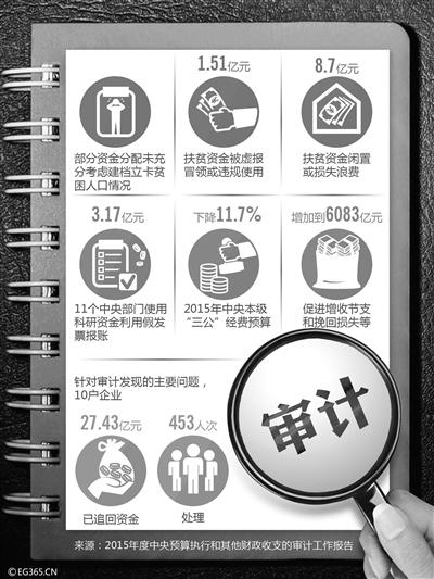 北京青年报记者获悉,本次审计涉及42个中央部门及241家所属单位,审计财政支出预算1891.62亿元,占这些部门支出预算总额的36%。2015年中央一般公共预算收入69267亿元,完成预算的100.1%,增长7.1%;中央一般公共预算支出80640亿元,完成预算的99.0%,增长8.4%;中央财政赤字11200亿元,与预算持平。