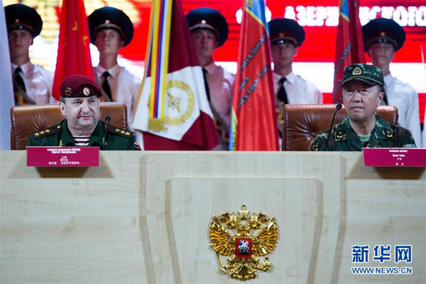 7月3日,在俄罗斯首都莫斯科,中国武警部队参谋长秦天少将(前右)和俄罗斯国民近卫军参谋长琴齐克(前左)出席启动仪式。