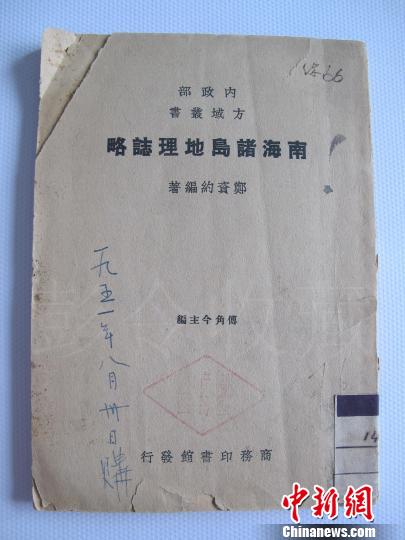 中新网北京7月4日电 (记者 应妮)1947年11月印行的《南海诸岛地理志略》首次明确中国海疆轮廓。重要的是,该书附有中华民国内政部首次公布的《南海诸岛新旧名称对照表》,其中的“民主礁”即今“黄岩岛”。该书收藏者、中国收藏家协会书报刊收藏委员会执行主任彭令4日向中新社记者表示,愿将该书原件无偿捐赠国家公藏机构。