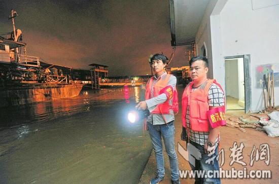 图为:昨晚,武汉防汛人员挑灯夜战加固闸口、巡查堤防。楚天都市报记者李辉摄