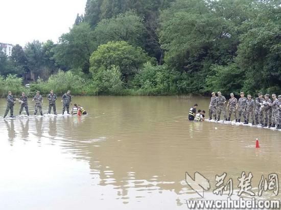 “这里管涌水流涌出变大了……”现场一名水务工作者突然喊道。噗通一声,战友们发现卢干事一手抱着一个沙袋,跳进了湖中,协助水务人员堆垒沙包。霎那间,湖面围堰上的人墙就像一根传输带,沙包在带面上飞速流转,约10分钟,险情得到控制。