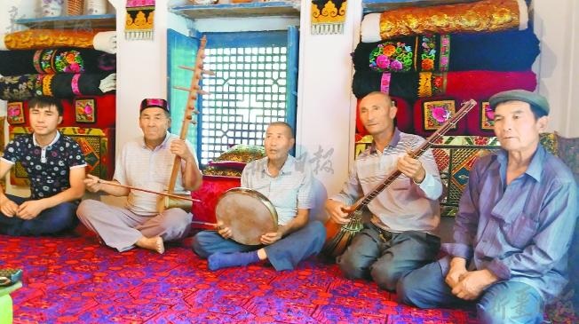 午饭刚过,老朋友卡德尔·阿不列力木和吾甫尔·阿不都拉就相约着来到于学然家串门。盘腿坐上会客室的大炕,几个人熟练地拿起乐器开始表演木卡姆。