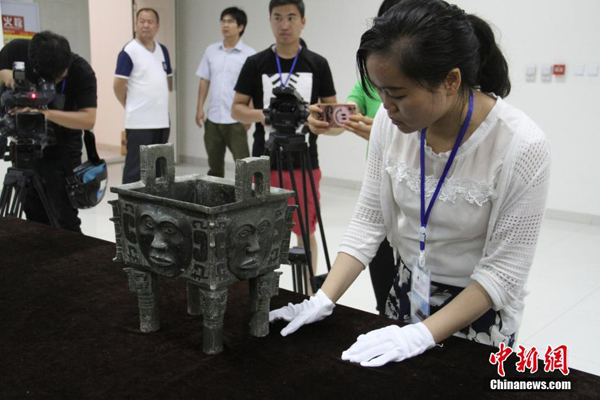 参展博物馆代表检查文物“大禾人面纹方鼎”。 中新社记者 钟欣 摄