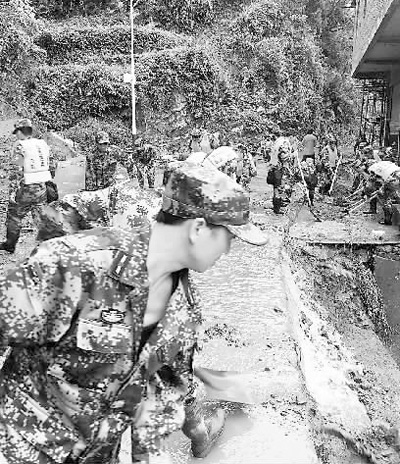 图为彝良县人武部组织民兵紧急抢通救援道路