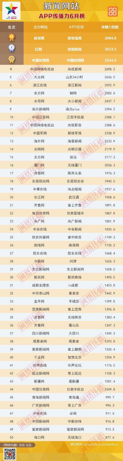 中央网信办《网络传播》杂志倾心制作的“新闻网站App传播力榜”今日重磅推出,旨在客观精准反映新闻网站每月的移动端传播效果。此次发布为2016年6月榜,统计时间为2016年5月15日至6月15日。