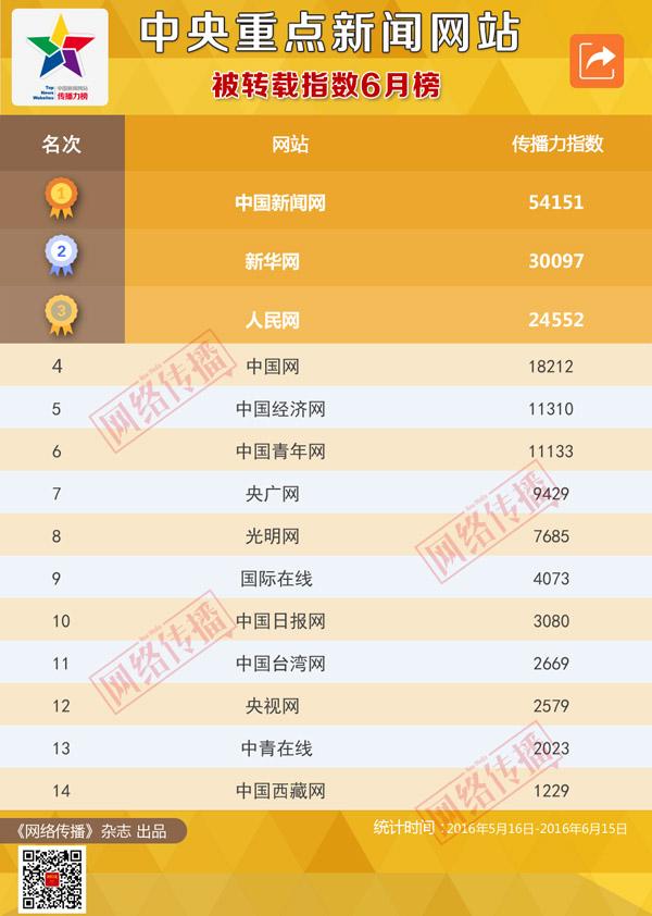 中央新闻网站2016年6月被转载传播力榜显示,中国新闻网、新华网、人民网占据前三甲;中国网、环球网、中国经济网、中国青年网、央广网、光明网、参考消息网分别位列第4至10名;前10强网站中,中央重点新闻网站占8席,全国行业新闻网站有2家。