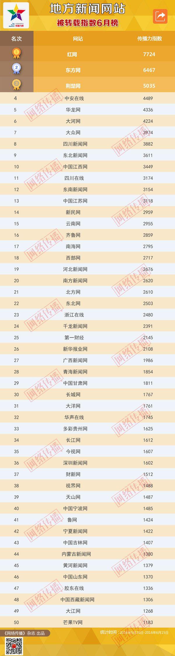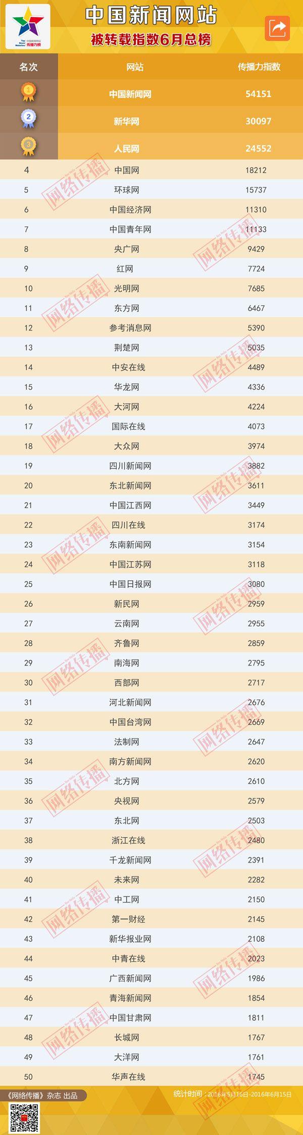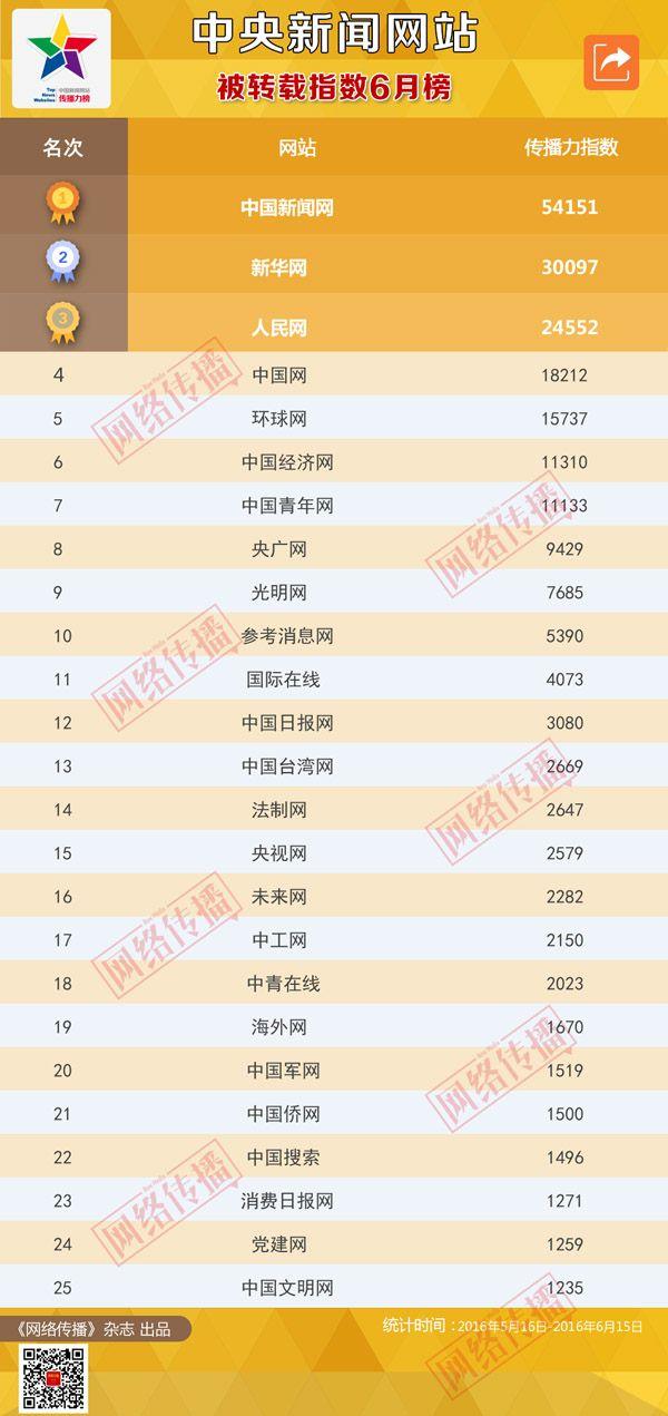 由中央网信办《网络传播》杂志精心打造的“新闻网站被转载指数”今日正式推出,旨在客观反映新闻网站原创报道内容在各类新闻网站中的传播效果。此次发布为2016年6月榜,统计时间为2016年5月15日至6月15日。