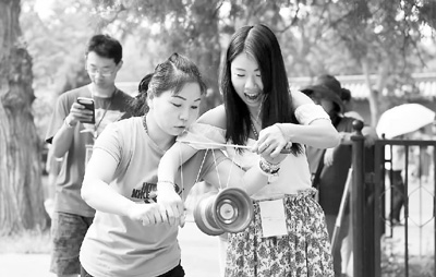 7月17日,北京天坛公园一名晨练者(前左)在教授香港青年抖空竹的诀窍。