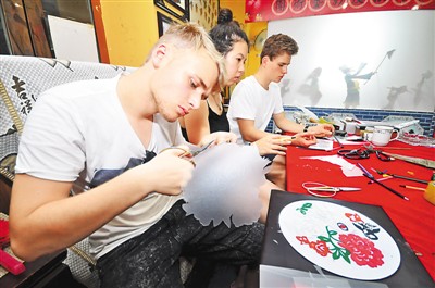 7月23日,在安徽省合肥市中心三孝口七桂塘非物质文化一条街,德国中学生在陶艺、皮影和剪纸传人的指导下学习体验,亲身感受“CHINA”(意为“中国”和“瓷器”)。