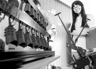 图为华中师范大学的学生在展示参赛项目“智能编钟演奏系统”。