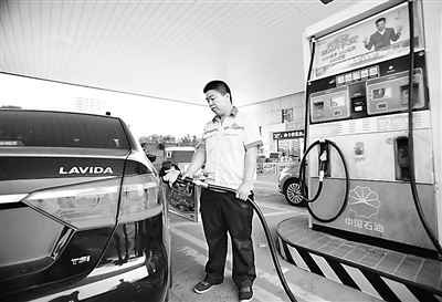 8月4日,国家发展改革委发出通知,决定将汽、柴油价格每吨分别降低220元和215元,测算到零售价格90号汽油和0号柴油(全国平均)每升分别下调0.16元和0.18元,调价执行时间为8月4日24时。图为河北省邯郸县一家加油站的工作人员给车辆加油。