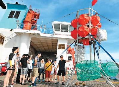 8月7日,来自北京、上海等地的10名深渊探索爱好者乘坐“兰金”号科考船,在所罗门海新不列颠海沟附近海域与中国万米级载人深潜器科考母船“张謇”号会合,并登上“张謇”号参观,与科学家们一起体验深渊探索。图为“彩虹鱼”项目团队科研人员(右一)向深渊探索爱好者介绍万米级着陆器。