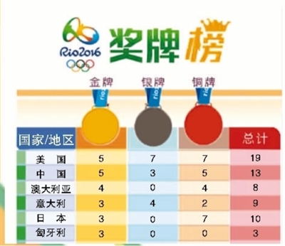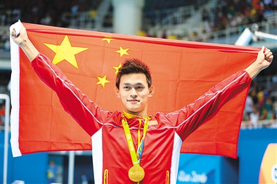 本报里约热内卢8月9日电 (记者张保淑)当地时间8月8日晚,在里约奥运会游泳赛场举行的男子200米自由泳比赛中,中国选手孙杨以1分44秒65的成绩夺得冠军。在同日进行的跳水比赛中,中国男子双人10米台组合林跃/陈艾森赢得金牌。截至当地时间8月9日13时,中国以5金、3银、5铜,与美国代表团并列第一,领跑金牌榜。