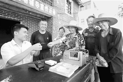 8月11日,江西省峡江县马埠镇上盖村村民在村便民服务点移动POS机上刷卡领取养老金。为解决山村群众参保缴费、取款不方便等问题,峡江县社保局与农商行协作,在全县每个行政村的人口密集处建立便民服务点,免费安装移动POS机。