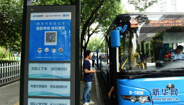 8月16日,乘客登上安装有支付宝收款机的杭州市506路公交车。