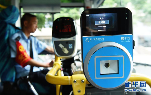 这是8月16日拍摄的杭州市506路公交车上的支付宝收款机。