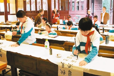 学生们来到杜甫草堂进行“草堂一课”的书法练习。