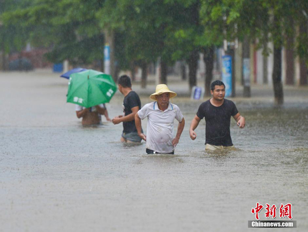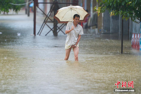 8月17日,海南省临高县市民在齐腰深的积水中缓慢前行。受热带低压影响,海南省政府当日17时继续发布暴雨一级预警,海南省国土资源厅与海南省气象局于17日16时联合发布地质灾害气象风险预警。截至17日17时,海南全省已转移15000多人。 中新社记者 骆云飞 摄