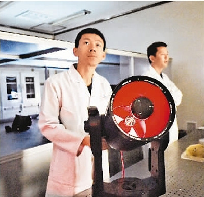 图为科研人员模拟地面望远镜,向量子卫星发射信标光。
