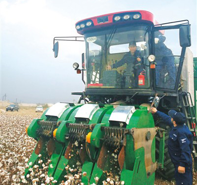 图为重庆机电研发的采棉机在采棉。 郑 璇摄