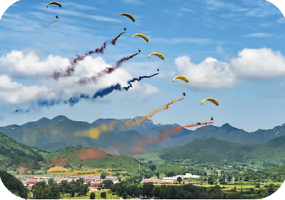 图为动力飞行伞在花海上空表演彩烟飞行。