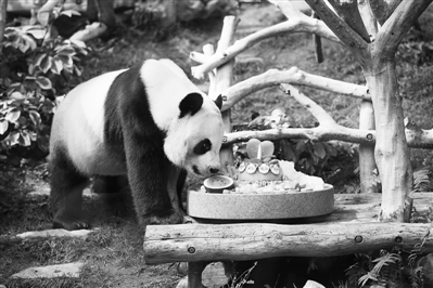 图为中央赠澳大熊猫“开开”在享用生日蛋糕。