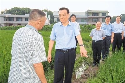 图为8月22日,李克强在瑞金考察途中,临时停车走进稻田与农民交谈,询问粮食收购价格和种粮收入。