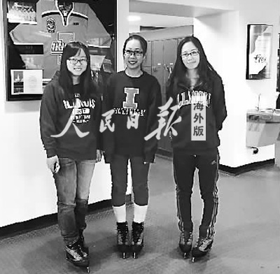 图为刘秋雯(中)在美国交换时选修有趣的溜冰课。