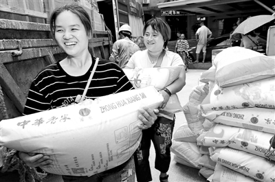 图为8月16日,闽清县梅城镇溪口社区受灾群众在救灾物资发放点领取大米。