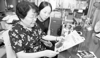 图为林月婵(左)展示扶贫杂志刊登的她当年在宁夏西海固扶贫考察时,与当地回族妇女亲切交谈的照片。