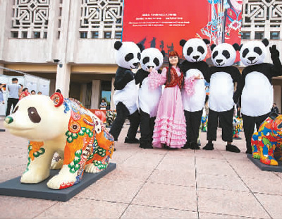 图为哈萨克斯坦国立大学大学生宫前展出的大熊猫艺术装置。