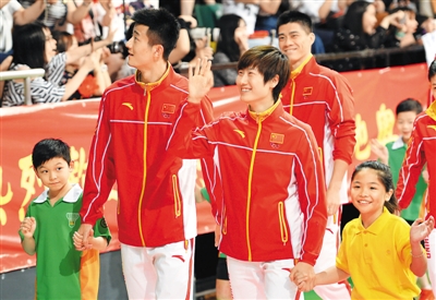 羽毛球运动员谌龙(前排左二)、乒乓球运动员丁宁(前排右二)等牵着香港小朋友的手进入伊利沙伯体育馆,与现场观众进行互动。