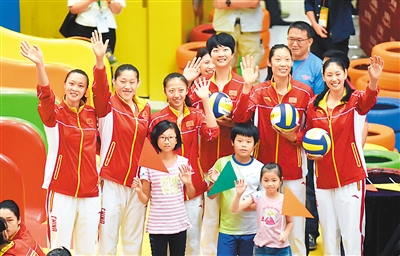 国家女排球员惠若琪、刘晓彤、丁霞、袁心玥、朱婷及颜妮(后排由左至右)向市民挥手致意。
