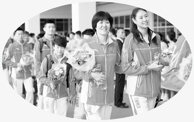 8月29日,里约奥运会国家奥运精英代表团一行抵达澳门外港码头,展开为期4天的访问。澳门特区政府在码头举行了欢迎仪式。图为中国女排主教练郎平(右二)等抵达澳门外港码头。