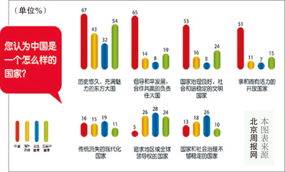 在调查中,“历史悠久、充满魅力”成为中国最突出的国家印象,选择该选项的受访者比例达到43%,其中发展中国家的选择比例更是高达54%。中国国民形象则被认为是“勤劳敬业”,其次的特点分别是集体主义、热情友善和诚实守信。