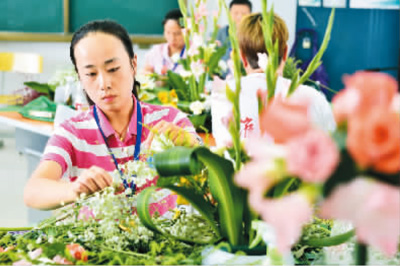 8月11日,在合肥举办的第八届安徽省残疾人职业技能竞赛上,参赛选手进行插花比赛。