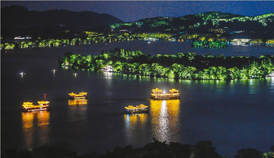 雨后的西湖,烟波澹荡,秀美端庄。晚宴后,习近平和彭丽媛同贵宾们一起,在码头共乘画舫前往岳湖景区观看文艺演出。